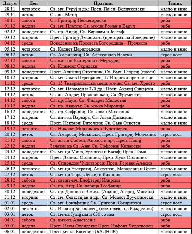 Погледнете ја табелата со годинешните датуми, празници и правила за постење на Божиќните пости.